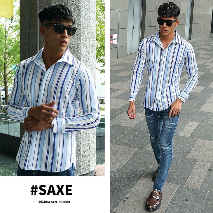 トップスに細見えの代表格である「ストライプ」のシャツを使ったコーディネート。