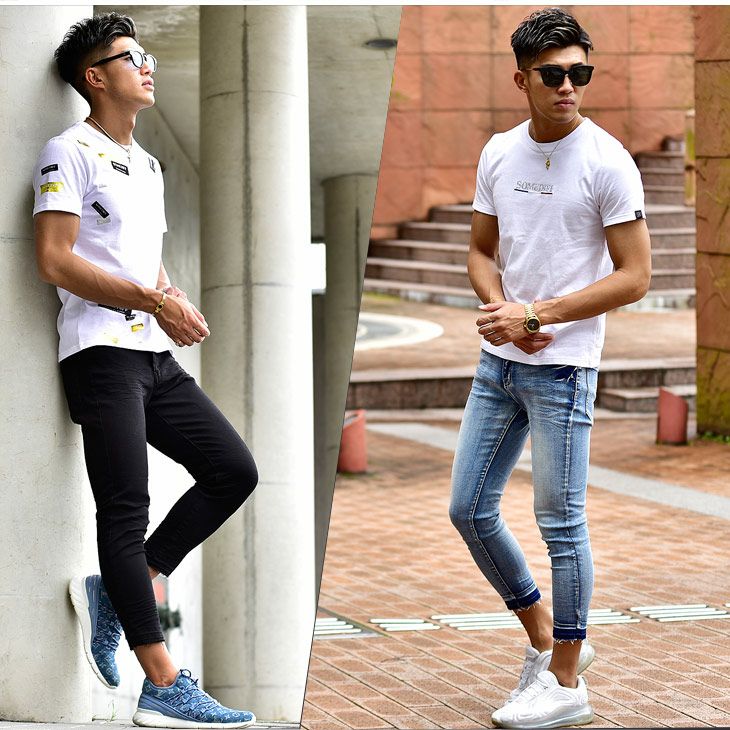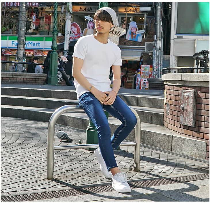 コーディネート自体は王道のホワイトTシャツ×スキニーパンツですが、このように小物使いでも「細見え」を作る事が出来るメンズコーデの一例です。