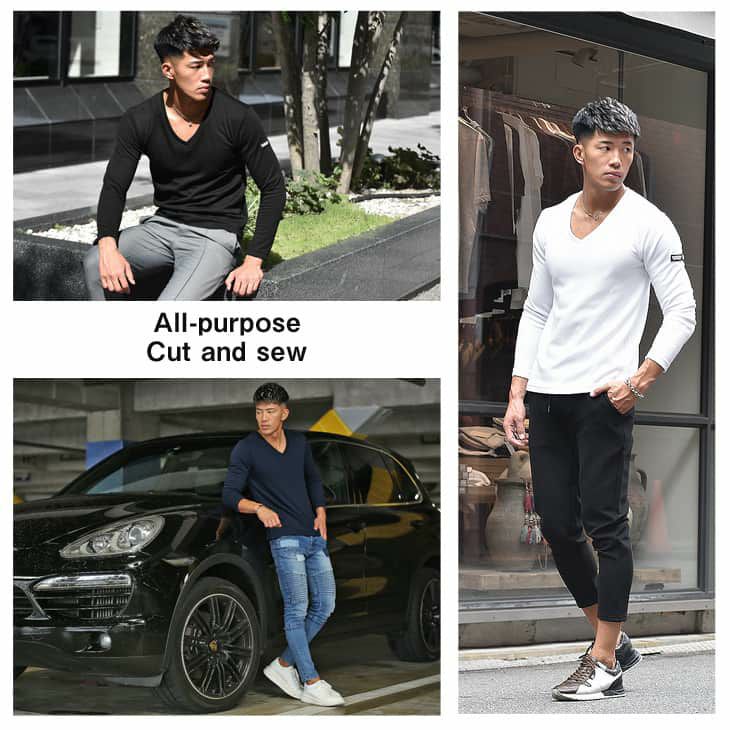 シャープな印象を与える鋭角なラインが特徴的なVネックには首元や顔まわりをスッキリ魅せる効果があります。