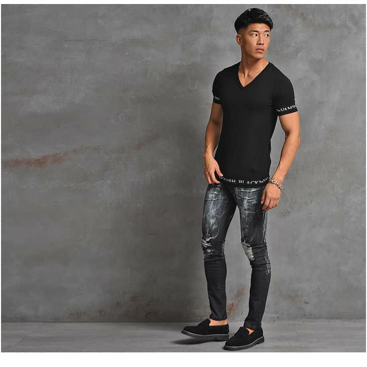こちらのコーディネートのようにシンプルなカットソーなどはVネックを選ぶことによって、全体的に細く見える効果を高めています。