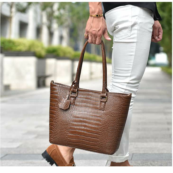 中の物が取り出しやすいトートバッグは、ポケットにスマホや財布を入れてしまわずにコーディネートをスッキリさせる意味もあります。