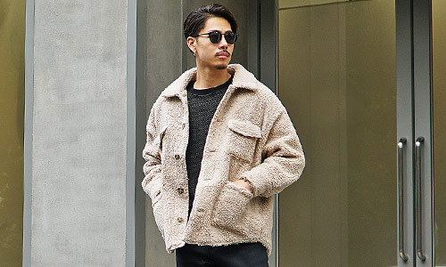 ムラ染めのカラーでクールにまとめたボアアウターのストリートスタイル。